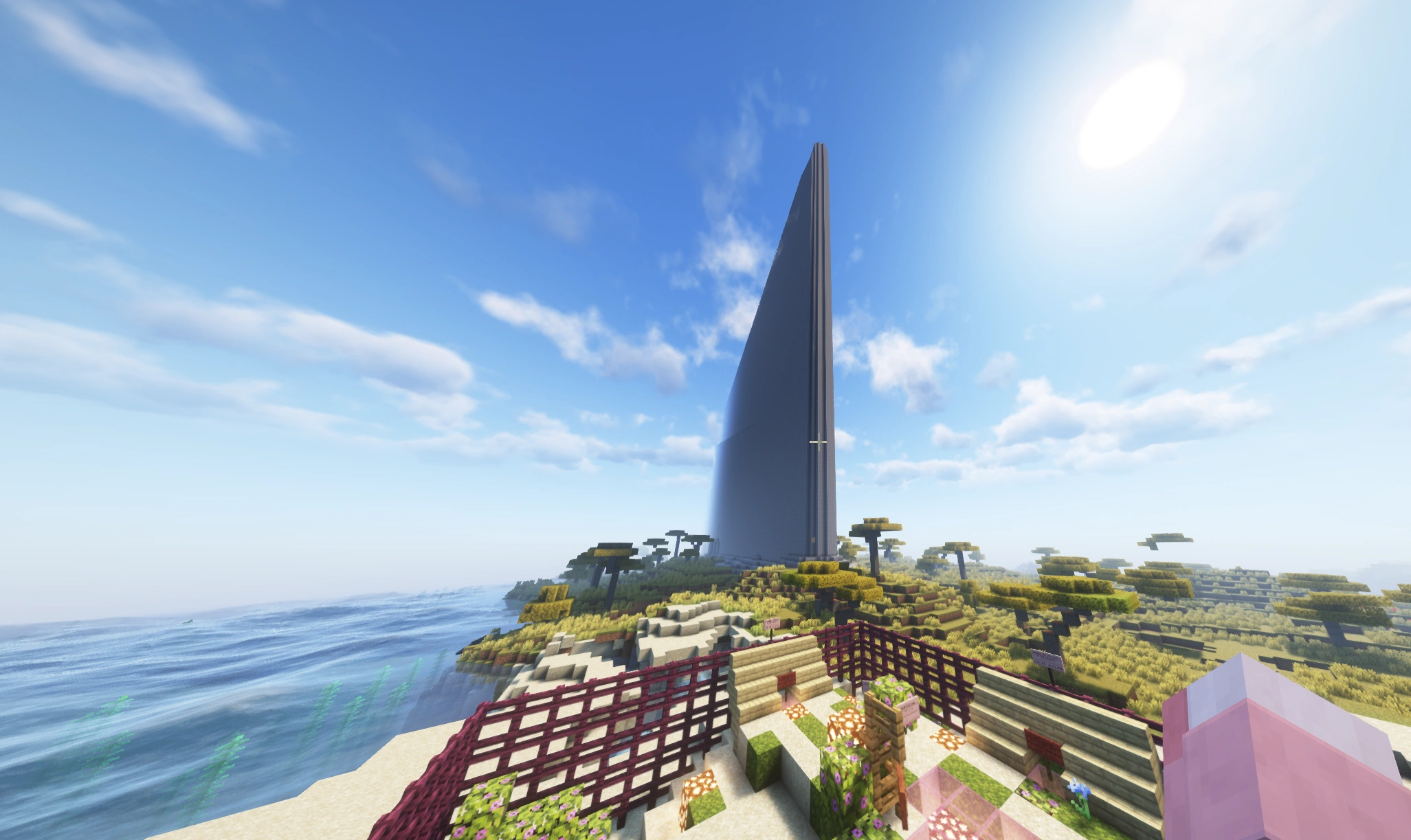Unlike many other anarchy servers, MelonAnarchy features spawn protection and a well-designed spawn area, aligning with the server's welcoming ethos. The spawn area is primarily composed of cherry blossom wood items, and is illuminated with glowstone. The pink color of the cherry trees was chosen to create a pleasant and inviting atmosphere. The spawn contains numerous signs directing users to exit spawn protection by moving at least 50 blocks away and warning them that beyond this point, they enter the wilderness where the unpredictable nature of anarchy servers begins.